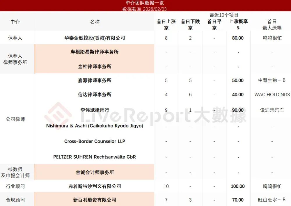 据LiveReport大数据统计,绿联科技中介团队共计12家,其中保荐人1家,近10家保荐项目数据表现良好;公司律师共计6家,综合项目数据表现平平。整体而言中介团队历史数据表现尚可。