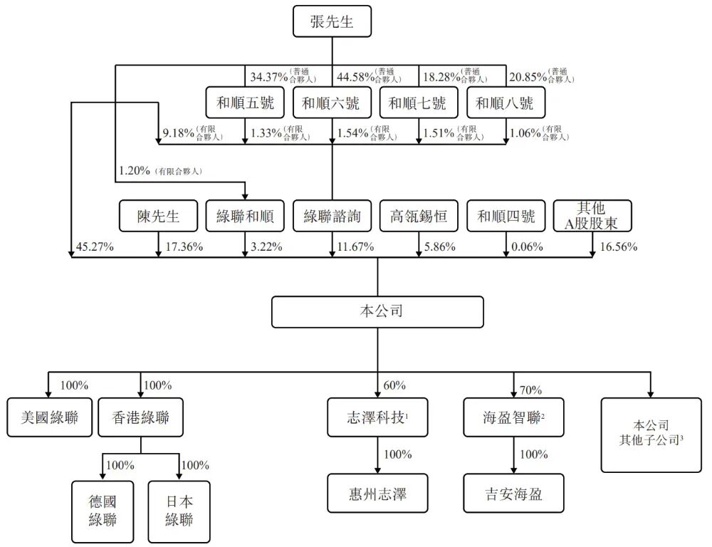 张先生、陈先生、绿联和顺、绿联咨询、高瓴锡恒、和顺四号分别持股45.27%、17.36%、3.22%、11.67%、5.86%、0.06%,其他A股股东合计持股16.56%。
