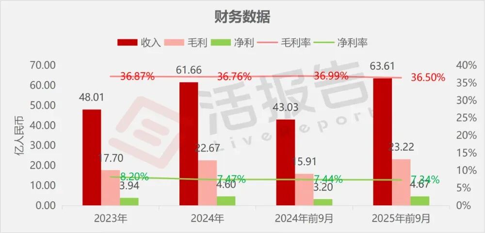 收入分别约为人民币48.01亿、61.66亿、43.03亿、63.61亿,2025年前9月同比+47.84%;