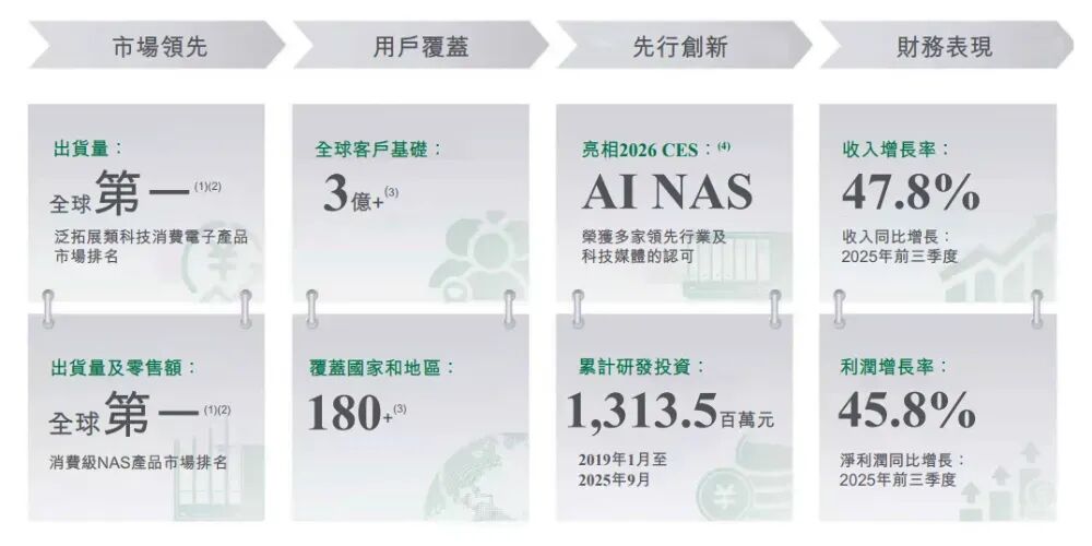 根据弗若斯特沙利文的资料,于2025年,公司按出货量计在泛拓展类科技消费电子产品市场位居全球第一。具体而言,按2025年零售额计,公司于全球充电产品市场中位居第二。按2025年出货量及零售额计,公司为全球最大的消费级网络附加存储(「NAS」)品牌,市场份额分别为20.6%及17.5%。