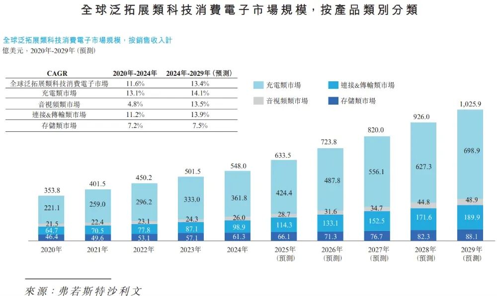 根据弗若斯特沙利文(Frost&Sullivan)的报告,当前,全球泛拓展类科技消费电子市场持续稳步增长。整体规模从2020年的353.8亿美元攀升至2024年的548.0亿美元,期间年复合增长率达11.6%。预计到2029年,该市场规模将达1025.9亿美元,2024年至2029年间年复合增长率将达到13.4%。