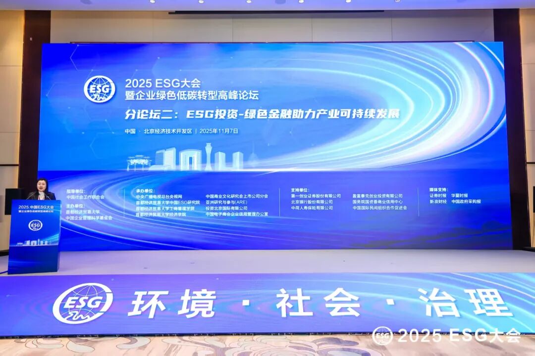 11月7日,由中国社会工作联合会指导,首都经济贸易大学、中国企业管理科学基金会主办的2025ESG大会暨企业绿色低碳转型高峰论坛在北京举行。在“ESG投资——绿色金融助力产业可持续发展”分论坛中,首都经济贸易大学中国ESG研究院副院长吴芙蓉作为主持人与来自金融机构、上市公司、专业服务机构及学术界的多位专家,围绕绿色金融政策前沿、产业转型升级路径、可持续投资新机遇等核心议题展开了深度对话与思想碰撞。