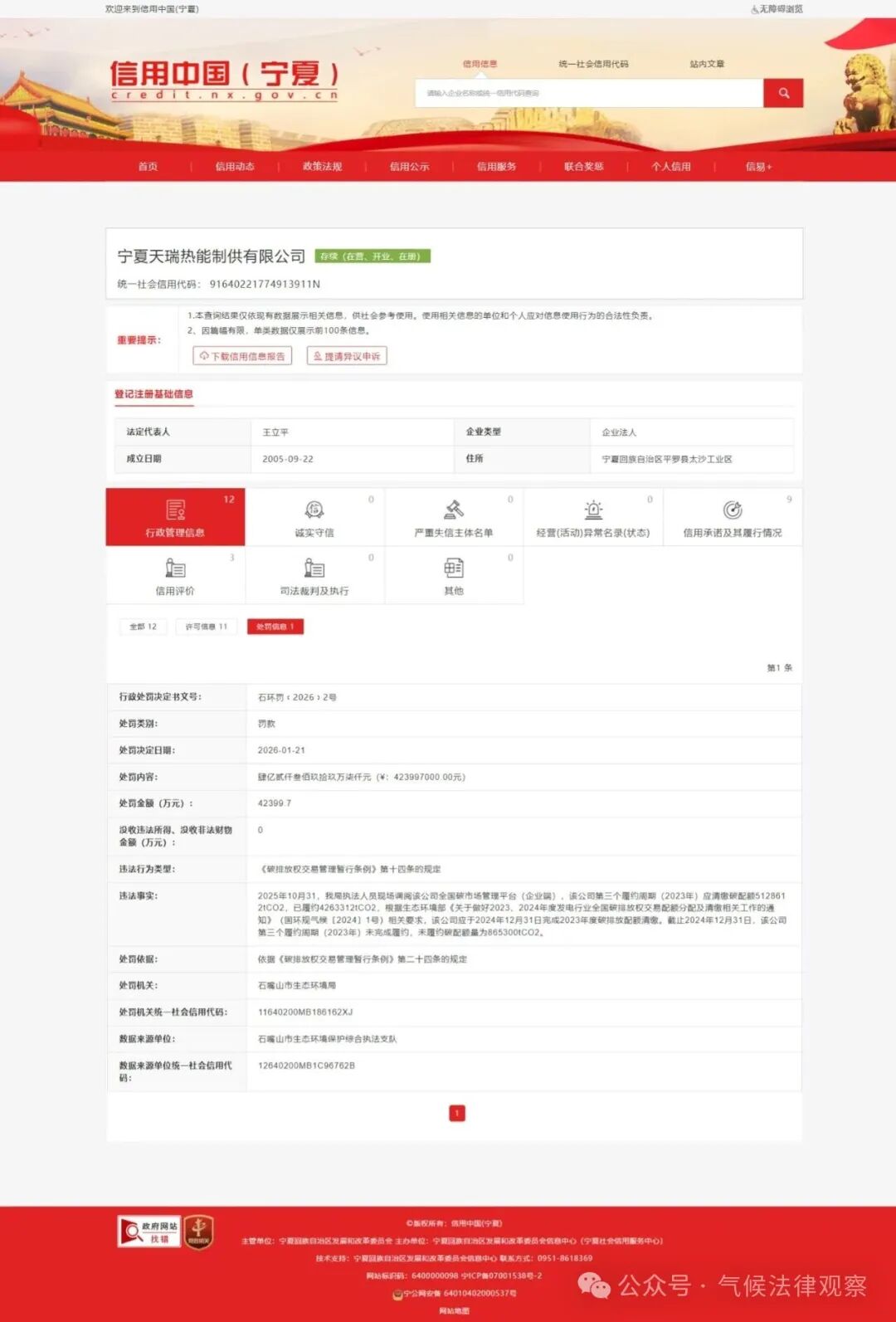 信用中国公开信息显示,宁夏宁夏天瑞热能制供有限公司因未在规定时间完成2023年碳排放配额清缴,被罚款4.2399亿元。这是目前公开可查询的适用《条例》实施行政处罚的第一起案例。值得注意的是,该公司在2024年就曾经因为未完成碳排放配额清缴履约被罚款2.9万元(按照当时有效的《碳排放权交易管理办法(试行)》,最高处罚金额为3万元),这也凸显了重点排放单位在碳排放履约合规管理的缺失。