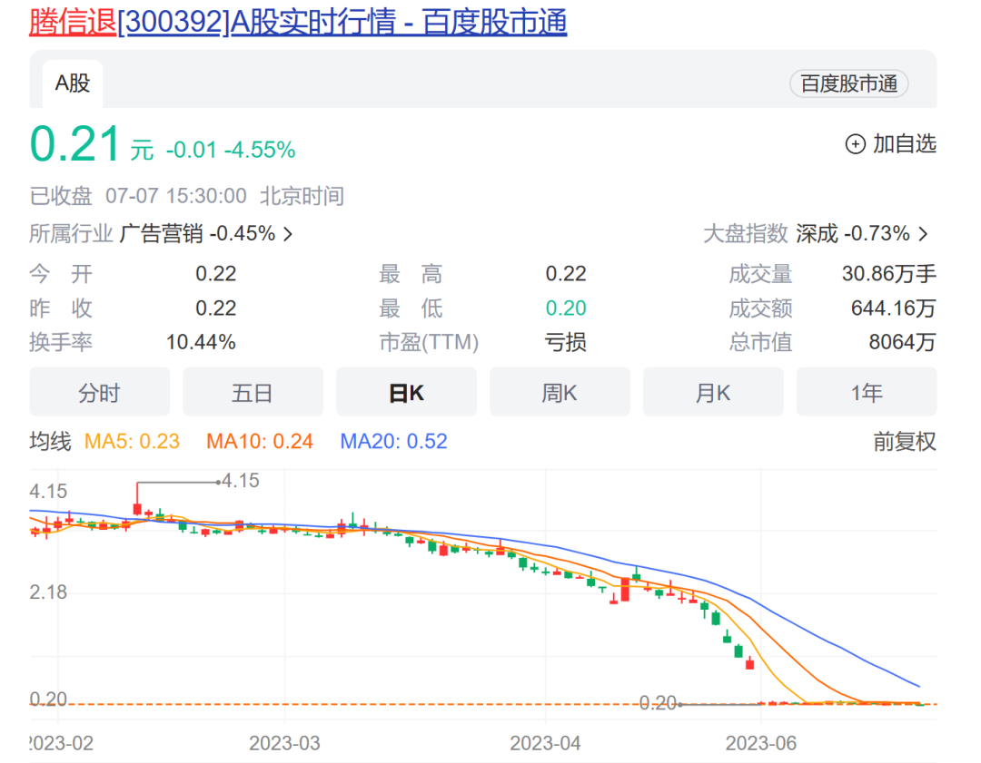 二级市场方面,投资者早已用脚投票,深南退、腾信退股价均低于1元/股。回溯2023年1月30日,深南退(时名“*ST深南”)发布业绩预告,官宣可能触发财务类退市消息,次日公司股价跌停,并开启连续跌停模式,股价一口气从超6元/股下挫至2.49元/股,随后震荡下行,在退市整理期前已跌至1.24元/股。