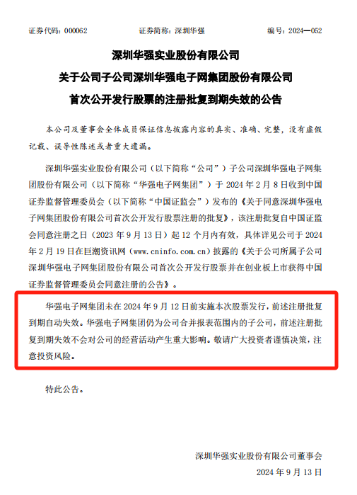 9月12日,深圳华强发布公告,公司子公司华强电子网集团未在2024年9月12日前实施本次股票发行,前述注册批复到期自动失效。华强电子网集团仍为公司合并报表范围内的子公司,前述注册批复到期失效不会对公司的经营活动产生重大影响。