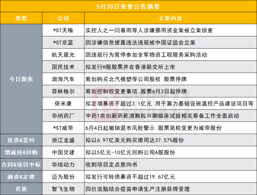 *ST京蓝(000711.SZ)公告称,公司于2025年5月30日收到中国证监会立案告知书,因涉嫌信息披露违法违规,中国证监会决定对公司立案。公司表示,此次立案不会对日常生产经营及运营活动产生重大影响,将积极配合中国证监会各项工作,并持续关注事项进展情况,及时履行信息披露义务。