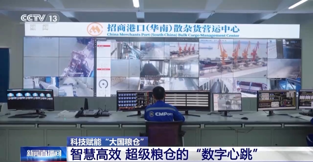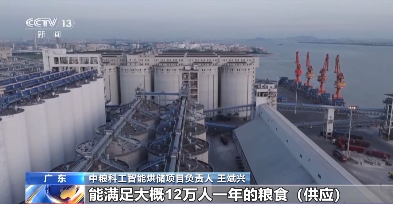 总台央视记者 蒋树林:我现在来到了位于广东东莞麻涌镇的粮食枢纽,整个枢纽占地面积是350多亩,相当于33个标准足球场的面积总和。如果用双脚去丈量整个粮库,要用将近一个小时的时间,但是在现代科技的加持下,现在可以实现“云上巡仓”。