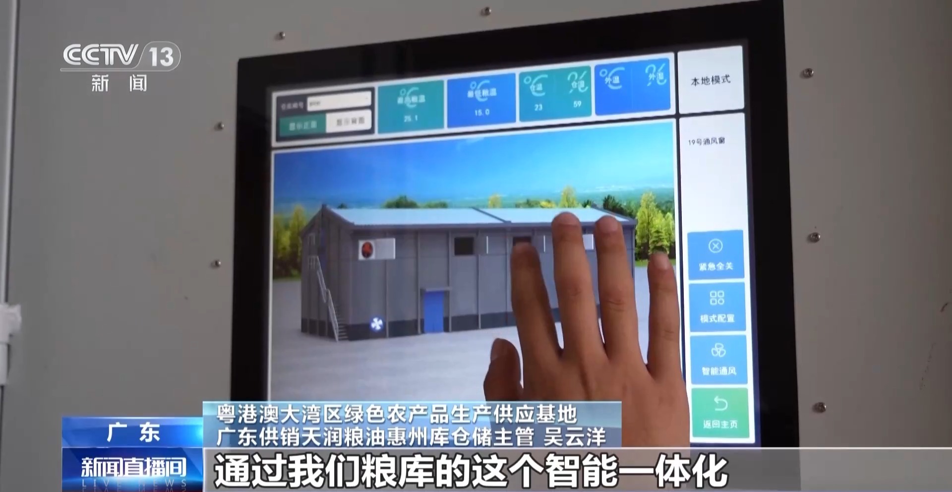 粤港澳大湾区绿色农产品生产供应基地广东供销天润粮油惠州库仓储主管 吴云洋:现在台风来了准备一键关窗,通过我们粮库的这个智能一体化,把窗户全部关闭。