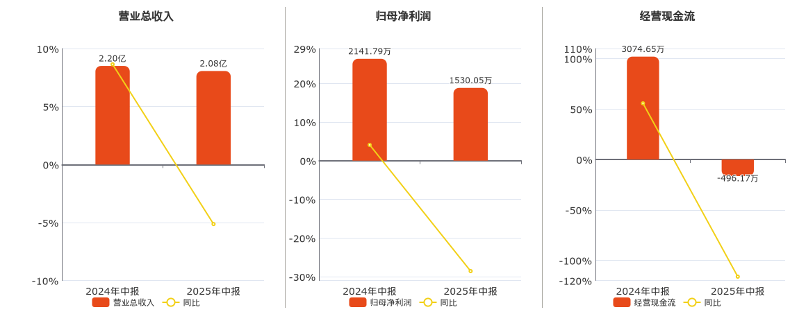 公司营业总收入为2.08亿元。归母净利润为1530.05万元。经营活动现金净流入为-496.17万元。