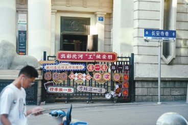 走在胡同里,网红市集的时尚喧闹与青春灵动迎面扑来。胡同西侧,商业城欧洲古典风格的拱券墙下,正上演着人生华章。新娘曳地的白纱如流云拂过缀满鲜花的铁艺灯柱,与巨大的“我喜欢沈阳”红心雕塑构成奇妙的对话。摄影师时而屈膝俯身,时而仰首捕捉,让精致构图的大片与胡同里蒸腾的市井烟火达成奇妙和解。不远处,几位身着改良汉服的少女手持团扇,恰立于“来炫一个”的霓虹招牌前,团扇轻摇,广袖缓舒,引得路人纷纷举起手机,将这混搭的瞬间定格成流动的诗行。