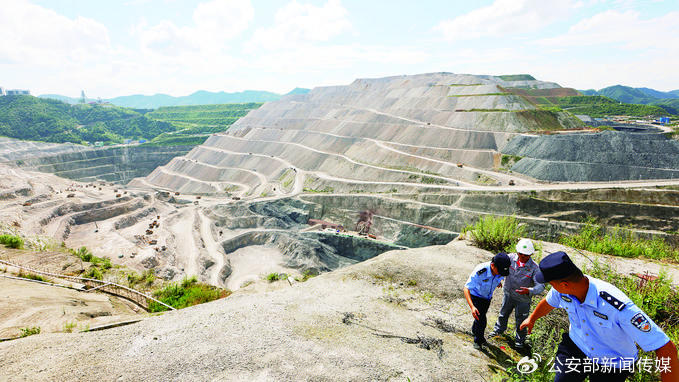 8月23日,在国内最大现代化单体露天磷矿山——贵州磷化集团白岩矿区穿岩洞矿,瓮安县公安局平定营派出所民警与企业员工一道巡逻,排查施工安全隐患。记者张铮 摄