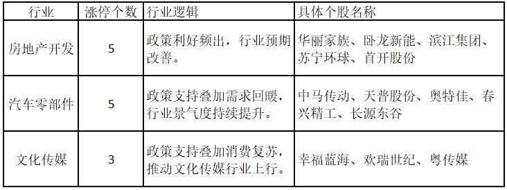 从行业特征来看,今日涨停板个股中,房地产开发、汽车零部件、文化传媒行业个股最多。