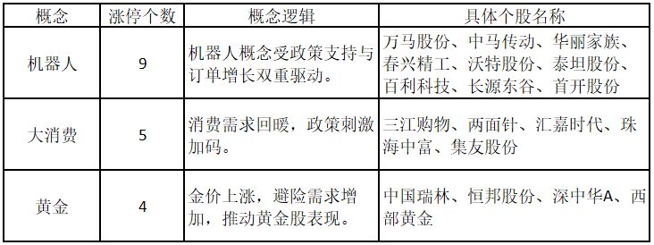 从概念特征来看,今日涨停板个股中,机器人、大消费、黄金概念个股最多。