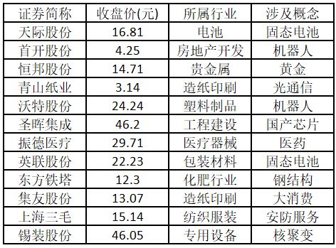 涨停板个股中,股价创出近1年新高的个股有12只(不包括创出历史新高的个股),包括天际股份、首开股份、恒邦股份、青山纸业、沃特股份、圣晖集成、振德医疗、英联股份、东方铁塔、集友股份、上海三毛、锡装股份,具体如下表所示。