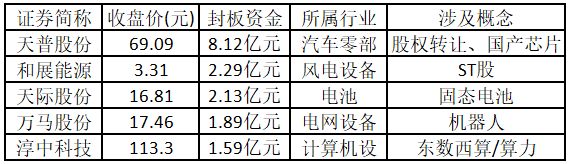 从封板资金来看,今日涨停板个股中,封板资金排名前5的个股包括天普股份、和展能源、天际股份、万马股份、淳中科技。