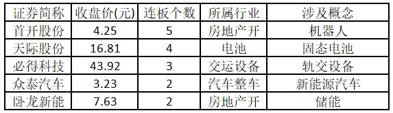 从连板情况来看,今日首板个股有41只;2连板的个股有5只;3连板及以上的个股有3只。今日连板数排名前5的个股包括首开股份、天际股份、必得科技、众泰汽车、卧龙新能,具体如下表所示。