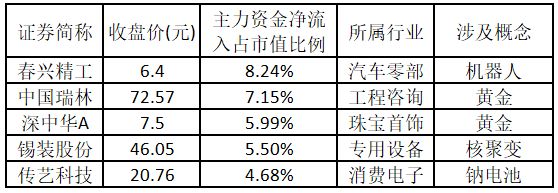 主力资金净流入金额占市值比例排名前5的个股分别为春兴精工、中国瑞林、深中华A、锡装股份、传艺科技。欢迎大家关注微信公众号“道达号”,“道达涨停复盘”栏目为大家复盘市场涨停数据。