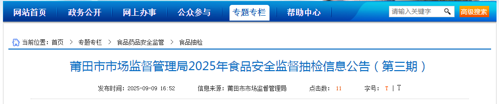 莆田市市场监督管理局2025年食品安全监督抽检信息公告(第三期)