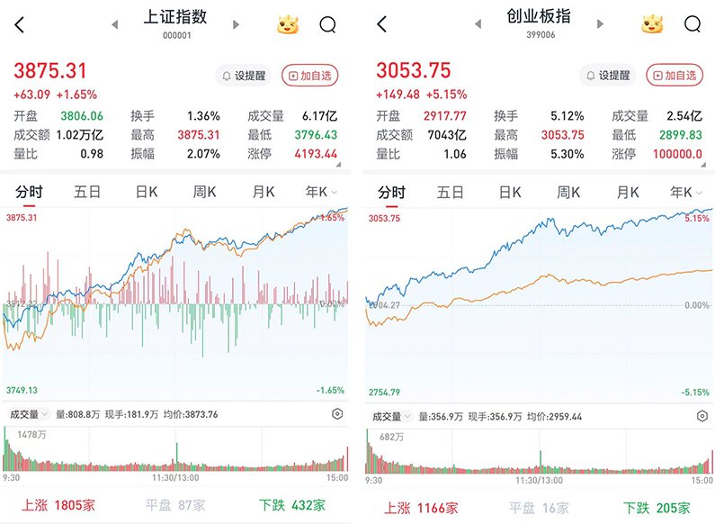 至收盘,上证综指涨1.65%,报3875.31点;科创50指数涨5.32%,报1326.03点;深证成指涨3.36%,报12979.89点;创业板指涨5.15%,报3053.75点。