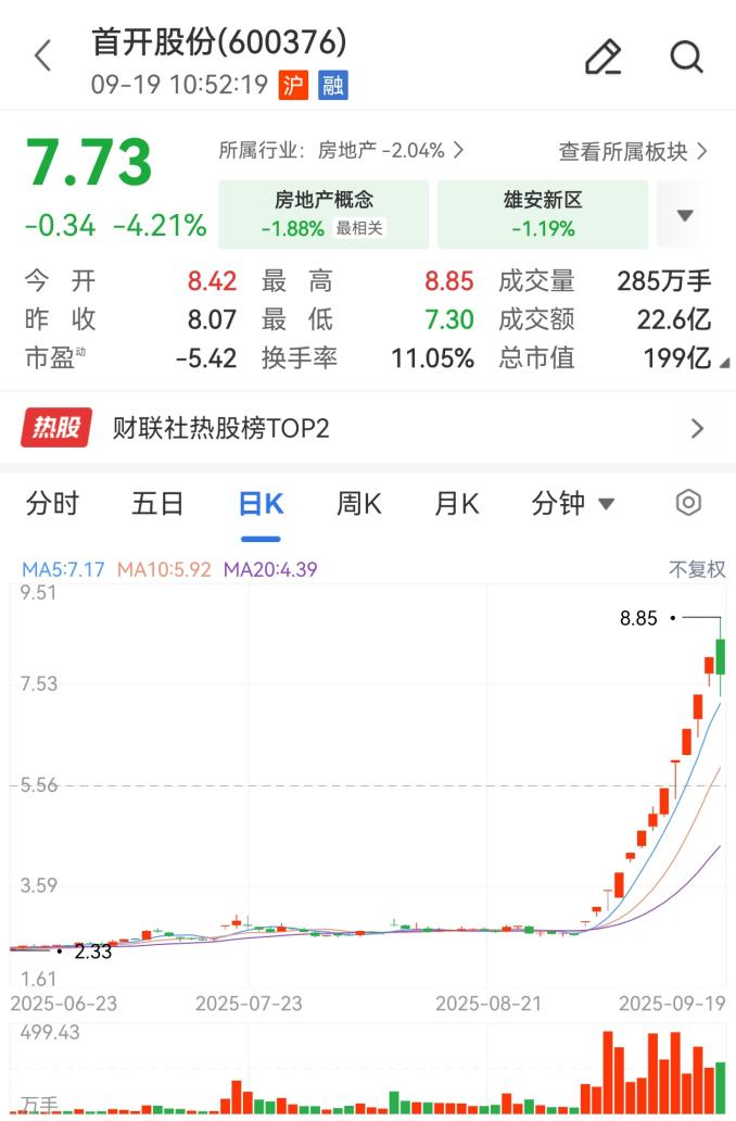 财联社9月19日讯,在12个交易日拿下11个涨停板后,9月19日早盘,房企首开股份股价出现大幅震荡,从高开并触及8.85元/股后又直线跳水,一度逼近跌停。截至发稿,该股跌幅缩窄至4%附近,报7.73元/股。而首开股份股价大起大落的背后,正是参股了智能机器人公司——宇树科技。