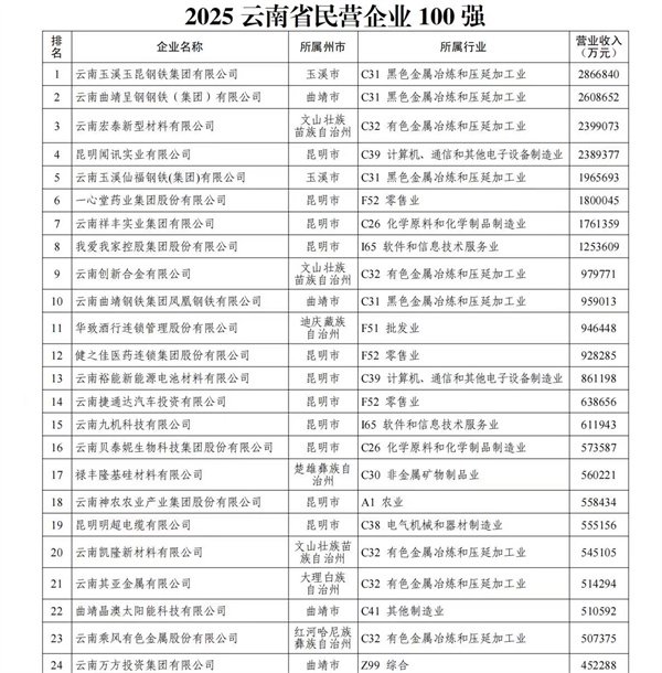 9月19日,省工商联发布2025云南省民营企业100强榜单,揭晓2025年云南省“民营企业100强”“制造业20强”“服务业20强”“创新能力20强”“吸纳就业20强”榜单,并发布《2025云南省民营企业100强分析报告》。报告显示,面对复杂多变的宏观环境,云南民营百强企业展现出发展韧性,整体规模稳中有进,产业结构持续优化,创新与社会贡献稳步推进,为全省经济高质量发展注入动力。