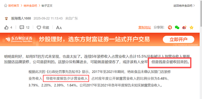 绝味食品投资者再股吧中表示少计营收应收回上市公司。图片来源:股吧