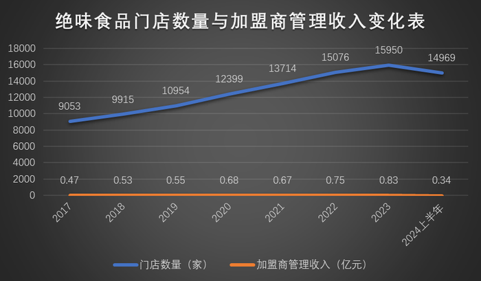 2019年是绝味食品门店数量的扩张高峰期。2019年门店数量首度突破1万家,2020至2023年分别为12399家、13714家、15076家、15950家。