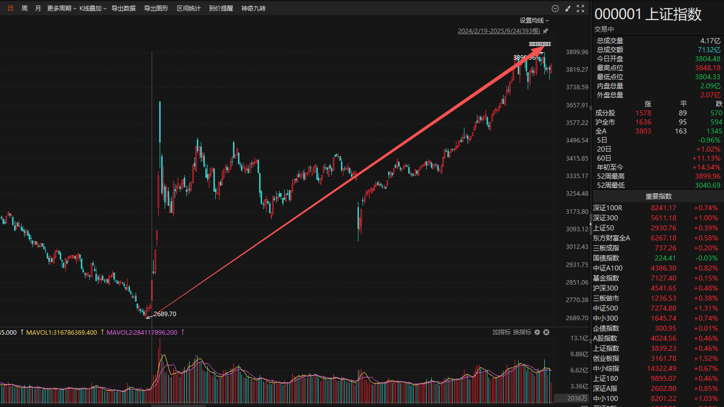 Choice数据显示,这一年来,A股总市值增超38万亿元至113.71万亿元;A股市场主要指数持续上涨,上证指数累计上涨约39%,深证成指累计上涨61.7%,北证50指数、科创50指数、创业板指涨幅均超100%。