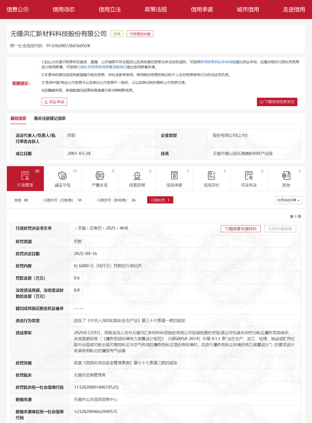 近日,齐鲁晚报·齐鲁壹点记者从信用中国获悉,无锡洪汇新材料科技股份有限公司因违反了《中华人民共和国安全生产法》第三十六条第一款的规定,被无锡市应急管理局罚款0.6万元。