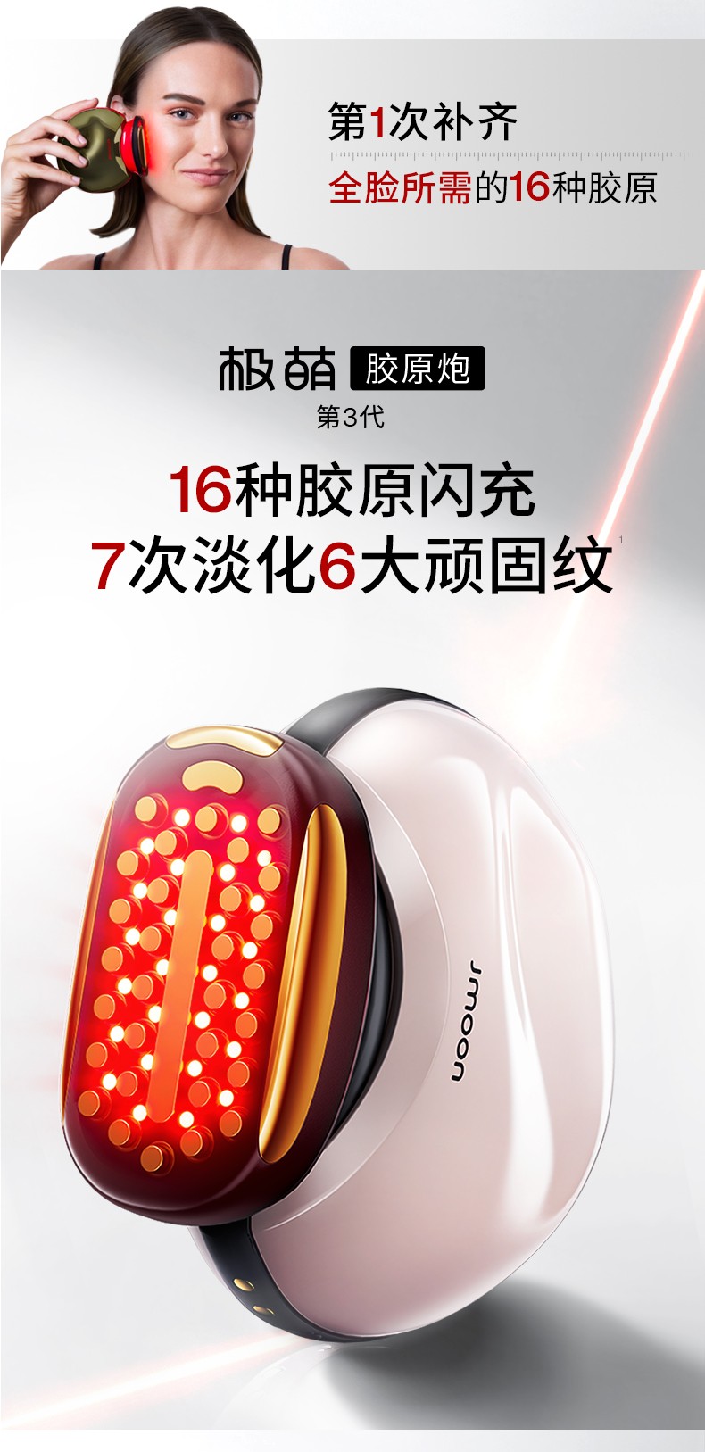 行业定位:极萌胶原炮打破了传统美容仪只能促生单一胶原的局限,首次将DNA胶原激活科技+零重力提拉紧塑结合,补足全脸16大胶原蛋白的同时,能收紧轮廓,尤其适合30+有松弛、凹陷、顽固纹路的人群。