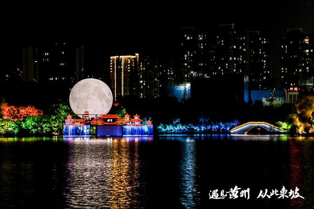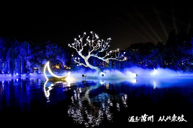 此次主题夜游以遗爱湖为舞台,串联起4公里沉浸式游览线路,精心打造“梦回大宋、腹有诗书、乌台诗案、寂寞沙洲、承天夜游、赤壁怀古、一蓑烟雨、千里婵娟”八大核心场景,每一处场景都是一段东坡故事的生动再现。为了让文化“活”起来,项目追求精品第一,运用多项前沿技术:全国最长水上灯阵码头,一秒穿越;全国首个雾幕竹林光廊再现“一蓑烟雨任平生”的旷达;可伸缩性机械卷轴与影视级视效,走进苏轼的人生至暗时刻;可升降帆幕搭配战船残骸造型舞台与水火秀装置,打造最具沉浸感的幻帆机械光影史诗;直径16米的“月亮”引领天上宫阙装置群雾,更是将“千里共婵娟”的浪漫意境拉满,全方位复刻苏轼的精神世界与黄州的人生轨迹。