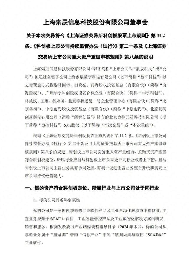 9月29日晚间,索辰科技公告,公司拟通过全资子公司上海索辰数字科技有限公司(以下简称“数字科技”)以支付现金方式收购马国华、田晓亮及前海股权投资基金(有限合伙)等10名股东持有的北京力控元通科技有限公司(以下简称“力控科技”)60%股权。交易完成后,力控科技将成为公司间接控股的二级控股子公司。经交易各方协商,力控科技100%股权交易定价为3.2亿元,对应60%股权的交易价格为1.92亿元。本次交易构成重大资产重组。