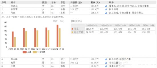 在公司去年业绩下滑的背景下,公司高管薪酬却不降反增。马良2024年薪酬为164.5万元,相较于2023年的144.1万元,增长了20.4万元,是三位副总经理中涨薪最多的,但仍低于另一位副总经理李永峰。李永峰在去年9月才担任公司副总经理,但其去年薪酬为169.7万元,为三位副总经理中的最高薪酬。