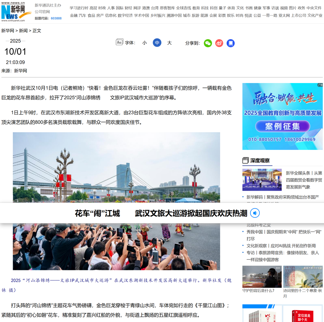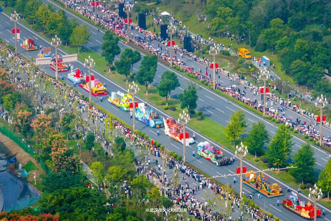 10月1日上午,由武汉市人民政府、湖北省文化和旅游厅主办,武汉市文化和旅游局、武汉东湖新技术开发区、湖北广播电视台承办的2025“河山添锦绣”文旅IP武汉城市大巡游活动,在武汉高新大道盛大举行。