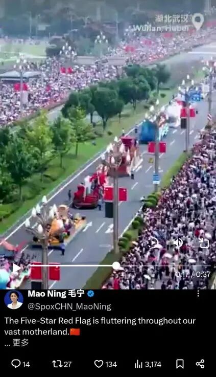 中国外交部官方头部账号“中国外交部发言人”、外交部新闻司司长毛宁账号,均多次向全球发布花车巡游的盛大场景。“官方天团”集体推介,巡游活动全球传播。