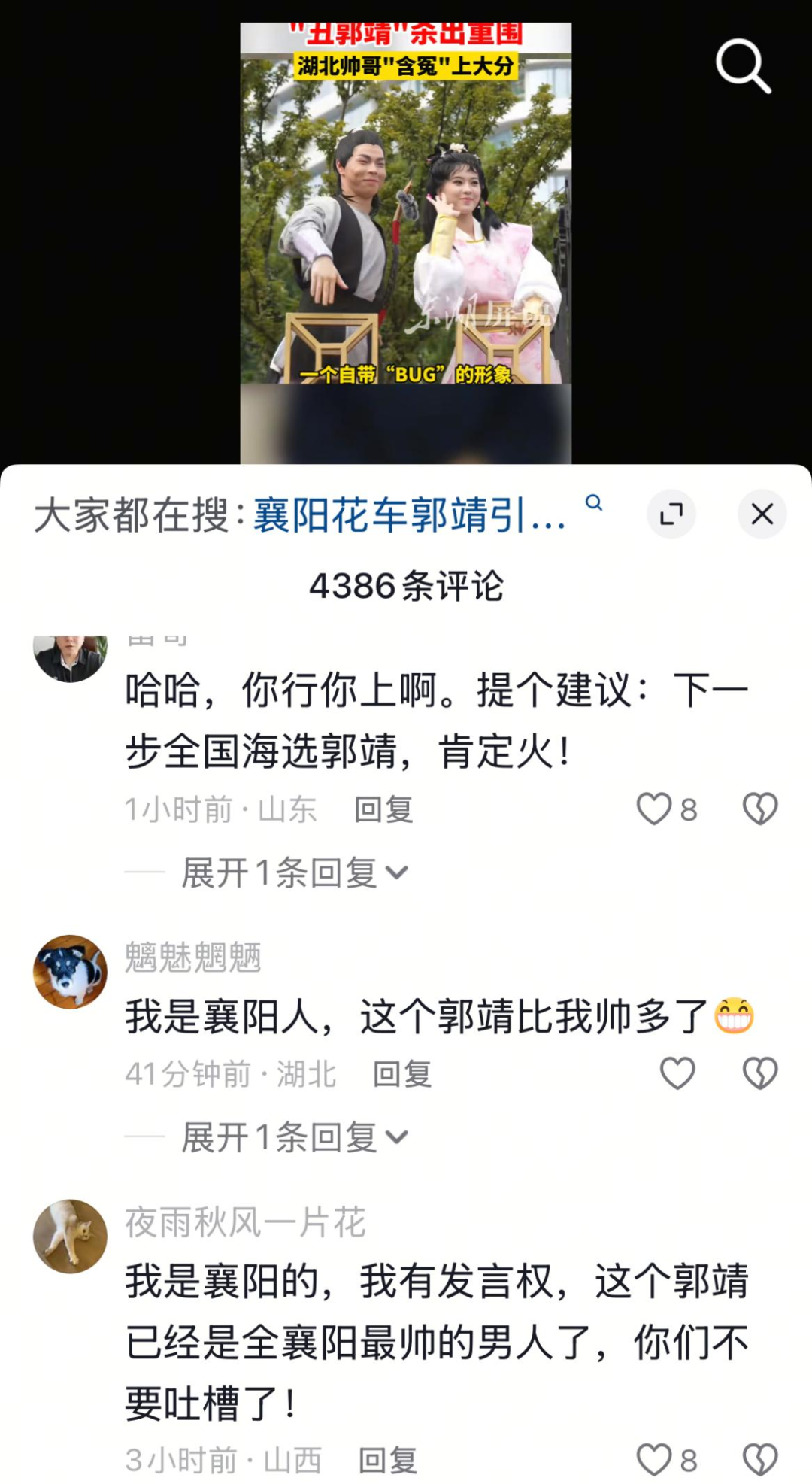 巡游还没结束,抖音爆款不断。“国庆湖北花车大巡游 扛起女友让她看个够”“穿尿不湿 骑肩膀 坐怀里 武汉小奶娃们看花车巡游萌翻全场”等短视频瞬间刷爆!其中,关于襄阳花车“郭靖”扮演者“丑萌”的话题迅速冲上热搜,引发网友集体“炸锅”。