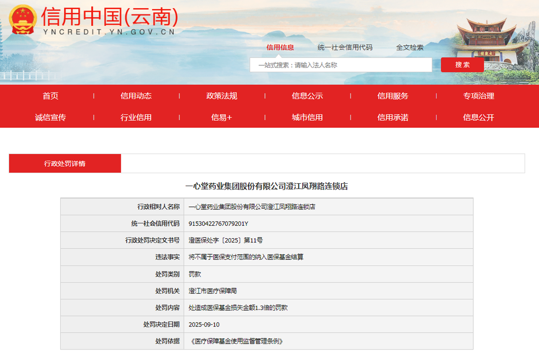 齐鲁晚报·齐鲁壹点记者于信用中国(云南·昭通)行政处罚栏了解到,10月12日,一心堂药业集团股份有限公司德钦河香中路连锁店因存在超量开药、未核验参保人医保凭证、无处方销售处方药等违规项目,德钦县医疗保障局对其发出行政处罚决定书医保处字〔2025〕第014号,责令其立即整改违规使用医保基金行为,责令其退回违规使用的医保基金1246.65元;对超量开药、未核验参保人医保凭证、无处方销售处方药违规项目涉及基金处2倍罚款(1246.65*2倍、2493.3元)。