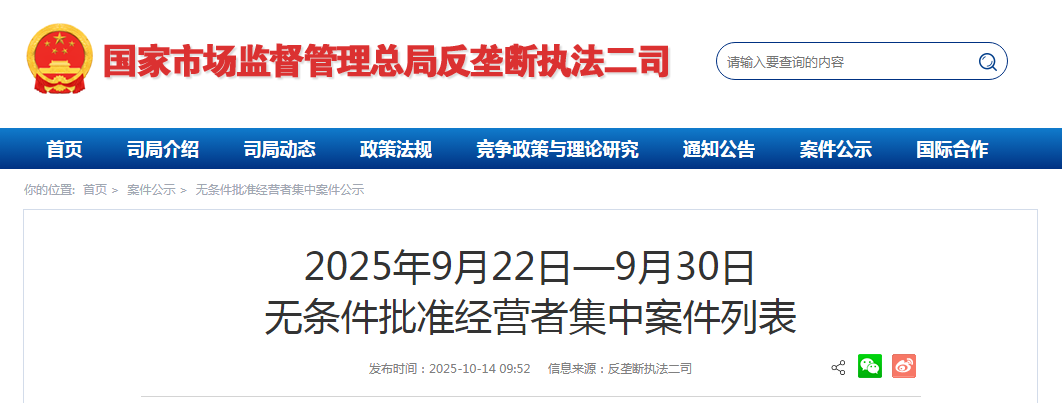 | 15 | 法国达飞海运集团公司收购阿尔赫西拉斯国际码头股份公司股权案 | 法国达飞海运股份有限公司,韩国韩新海运株式会社,阿尔赫西拉斯国际码头股份有限公司 | 2025年9月29日 |