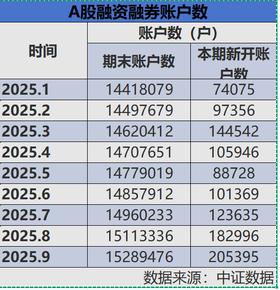 最新数据显示,2025年9月,A股新开融资融券账户20.54万户,环比增长12.24%、同比增长288%,创下年内新高。截至9月底,A股两融账户总数约1529万户。