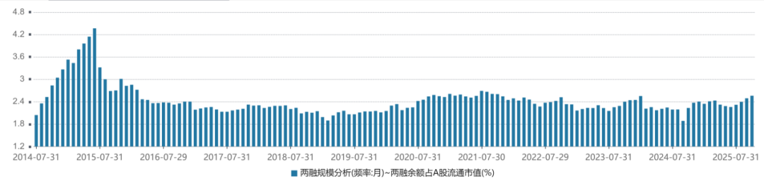截至10月16日,两融余额占A股流通市值仅为2.56%,远低于2015年6月的历史峰值4.37%,也略低于2021年的高位。