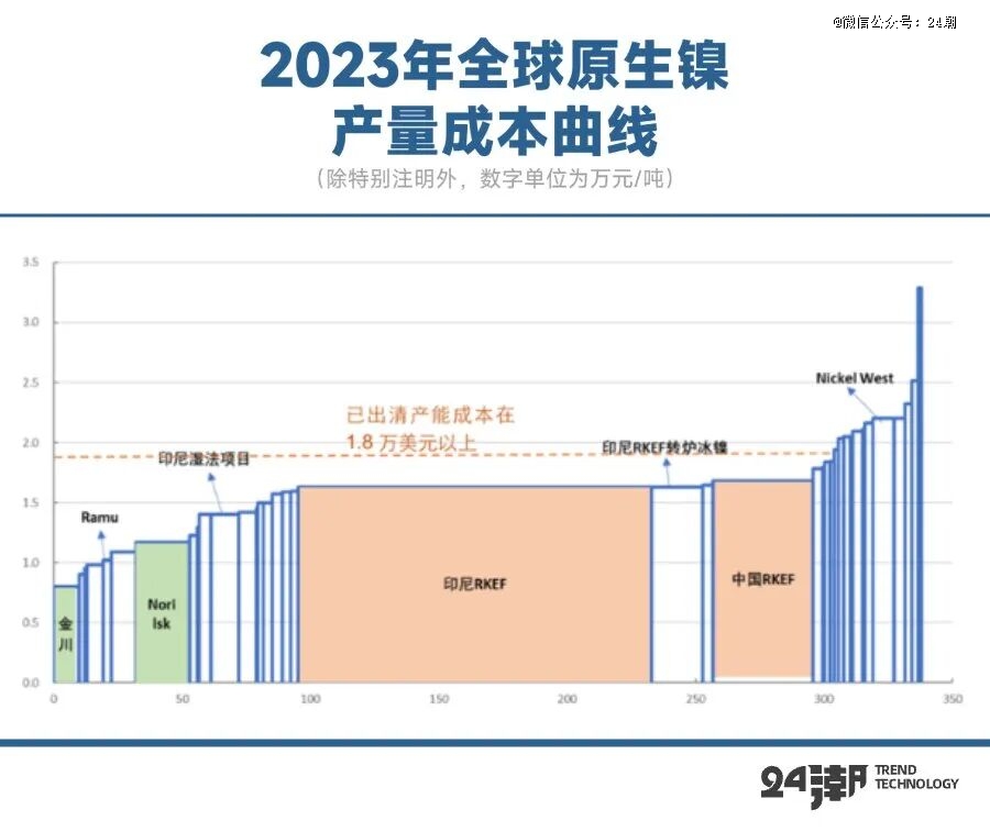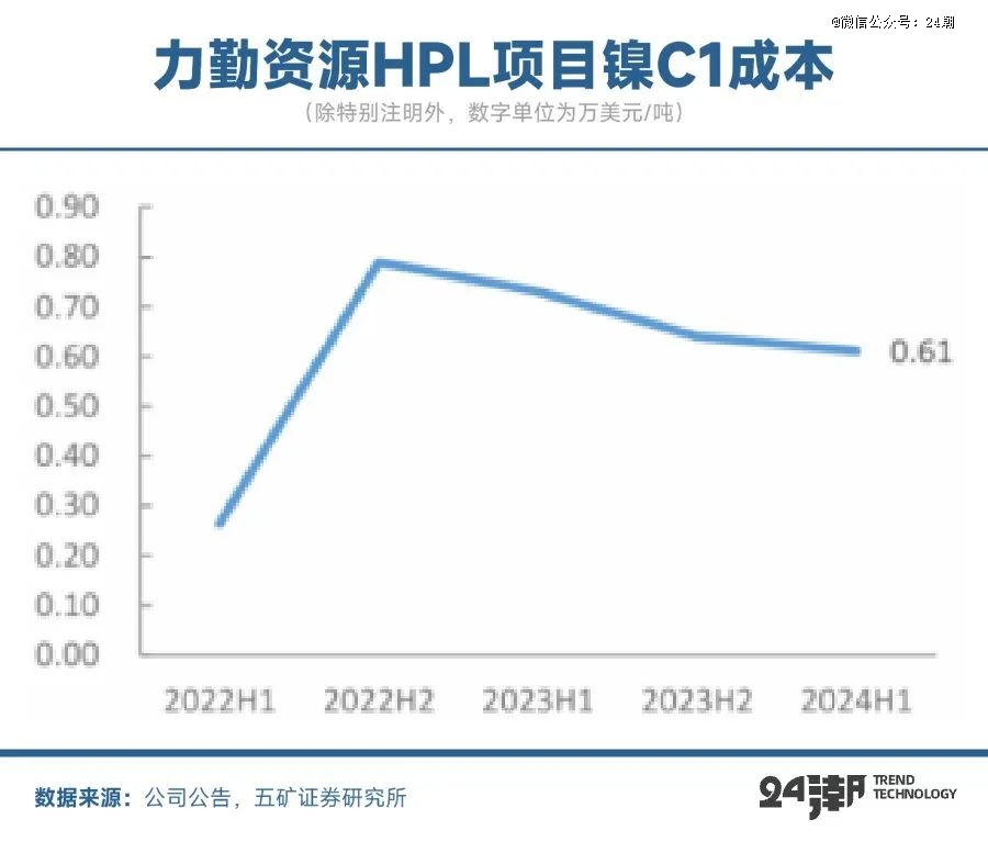 比如根据五矿证券的数据,以力勤资源为例,所用红土镍矿镍钴比10:1,钴营收作为镍成本抵扣,根据Hairita披露的钴金属价格较高的2022年上半年镍C1成本*达到了0.26万美元/吨,随着钴价回落以及红土镍矿原料价格上涨,2024年上半年抵扣后C1成本达到0.61万美元/吨。