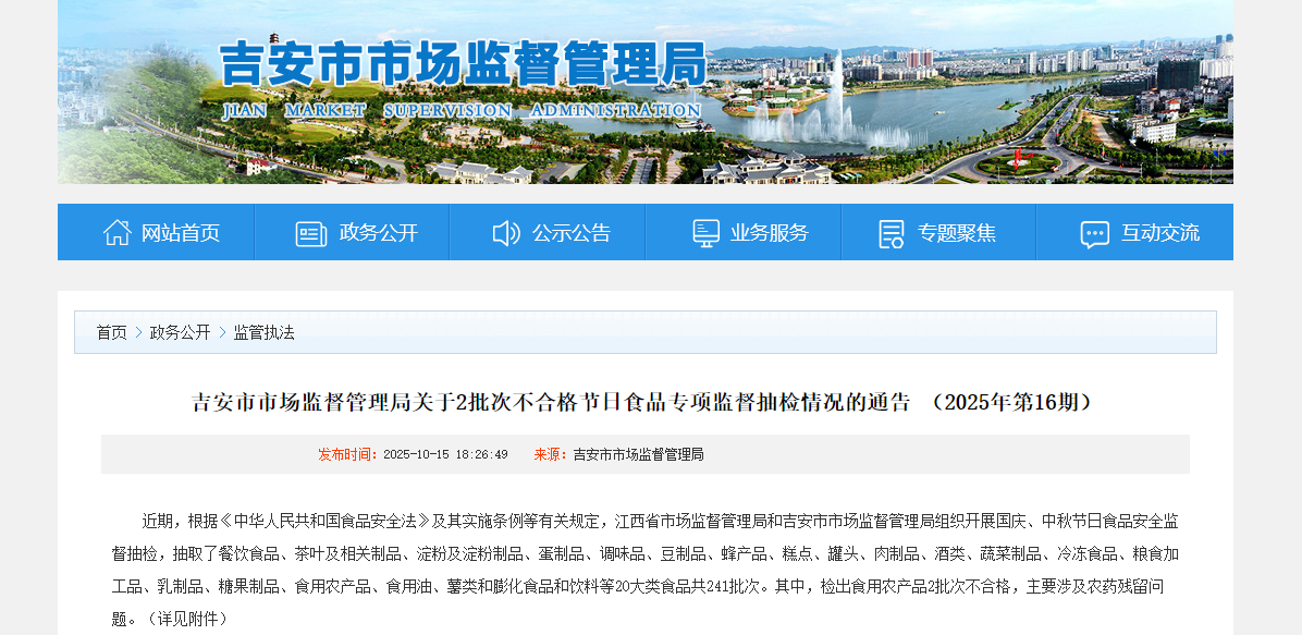 近期,根据《中华人民共和国食品安全法》及其实施条例等有关规定,江西省市场监督管理局和吉安市市场监督管理局组织开展国庆、中秋节日食品安全监督抽检,抽取了餐饮食品、茶叶及相关制品、淀粉及淀粉制品、蛋制品、调味品、豆制品、蜂产品、糕点、罐头、肉制品、酒类、蔬菜制品、冷冻食品、粮食加工品、乳制品、糖果制品、食用农产品、食用油、薯类和膨化食品和饮料等20大类食品共241批次。其中,检出食用农产品2批次不合格,主要涉及农药残留问题。(详见附件)