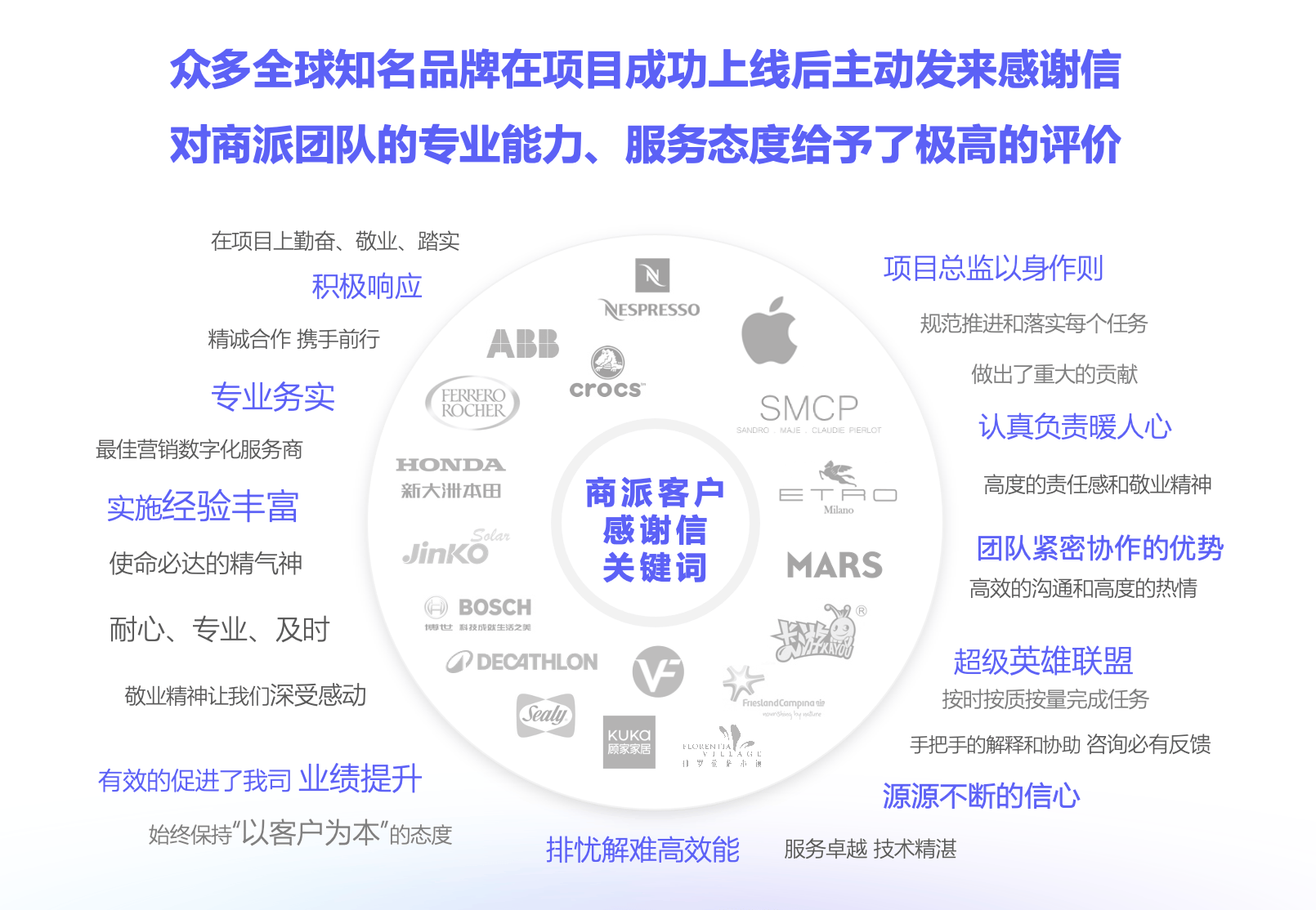 1·7项目交付满意度高,收获客户感谢信:商派商城系统和商派OMS系统近几年来累计服务超过上千家全球知名品牌企业客户。因为交付质量满意度高,商派收到了众多品牌客户发来的感谢信。例如,「佛罗伦萨小镇奥莱GO」商城上线后给商派发了两面感谢锦旗;雀巢集团旗下的高端咖啡机品牌奈斯派索(Nespresso)给商派先后发了三封感谢信。此外,丝涟Sealy、Crocs卡骆驰、顾家家居、皇家菲仕兰/美素佳儿、BOSCH博世电动、费列罗、SMCP集团、Apple苹果中国、新大洲本田、卡游、迪卡侬DECATHLON均向商派发过感谢信。商派还荣获了晶科能源“2024·最佳营销数字化服务商”奖项 。