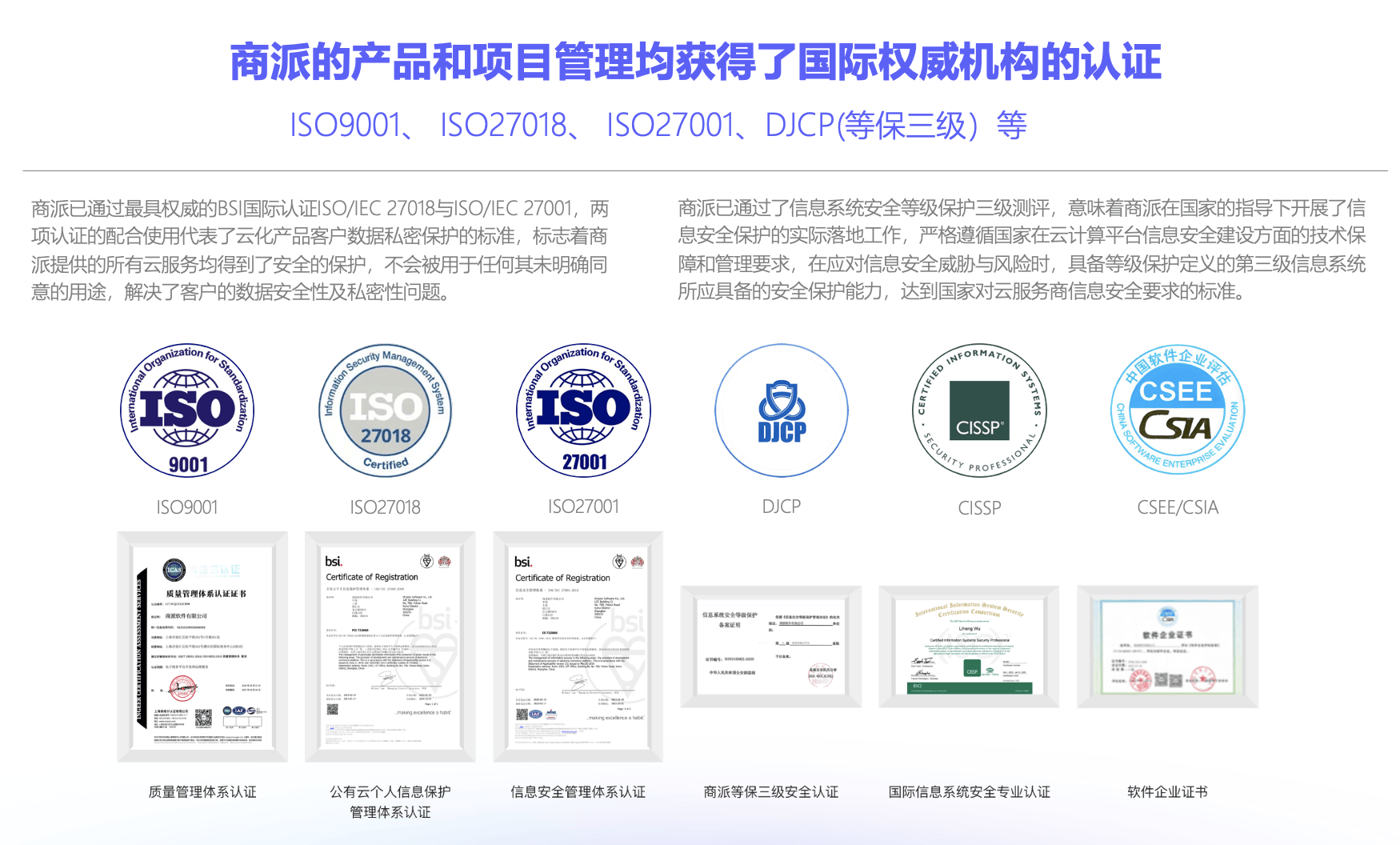 1·1安全资质完善:商派拥有ISO9001、ISO27001、ISO27018三项认证,以及 “双软认证”、“三级等保”资质、CISSP安全证书。