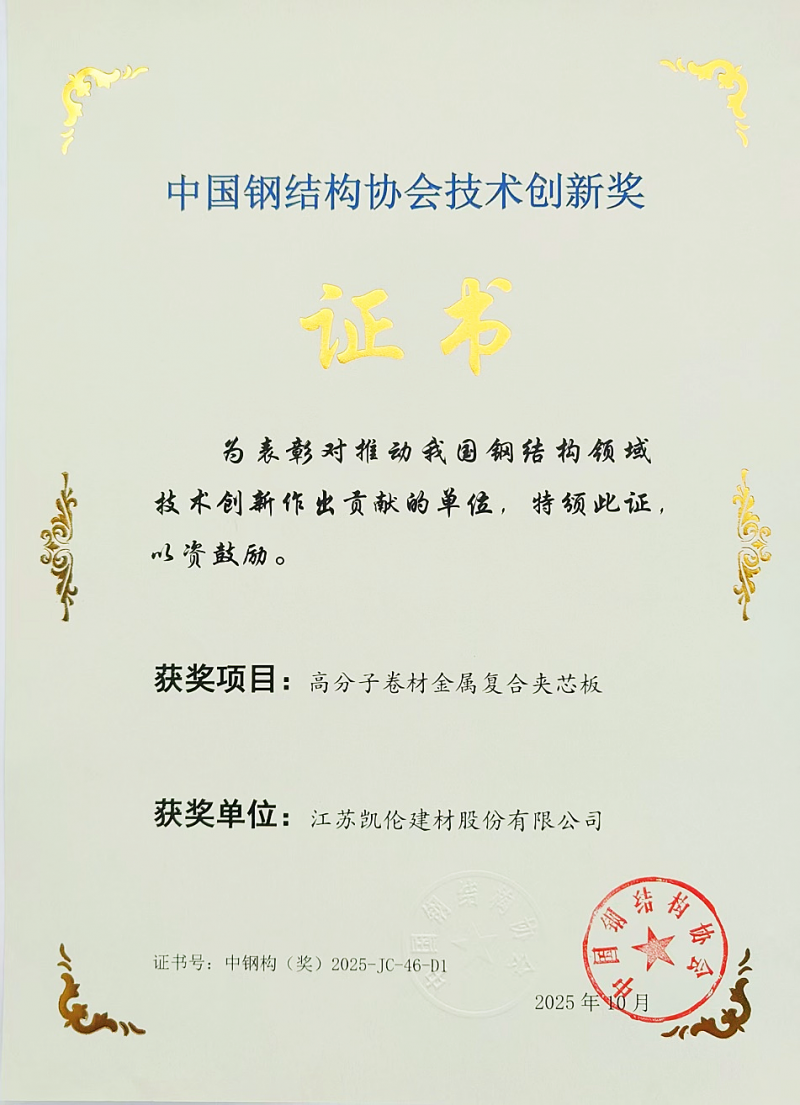 值得一提的是,此次是凯伦股份连续第二年荣获该奖项。此前,凯伦股份《高分子卷材金属复合板及其工程应用》也曾荣获2024年中国钢结构协会技术创新奖。