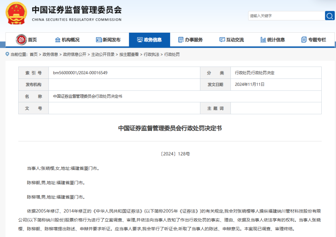 2024年,证监会出具行政处罚决定书。根据调查结果,张晓樱主导了多数账户的交易决策,并安排人员下单,陈柳毅和陈柳增则通过提供资金和账户参与操纵。最终,张晓樱需承担4910万元的违法所得及1.47亿元的罚款。