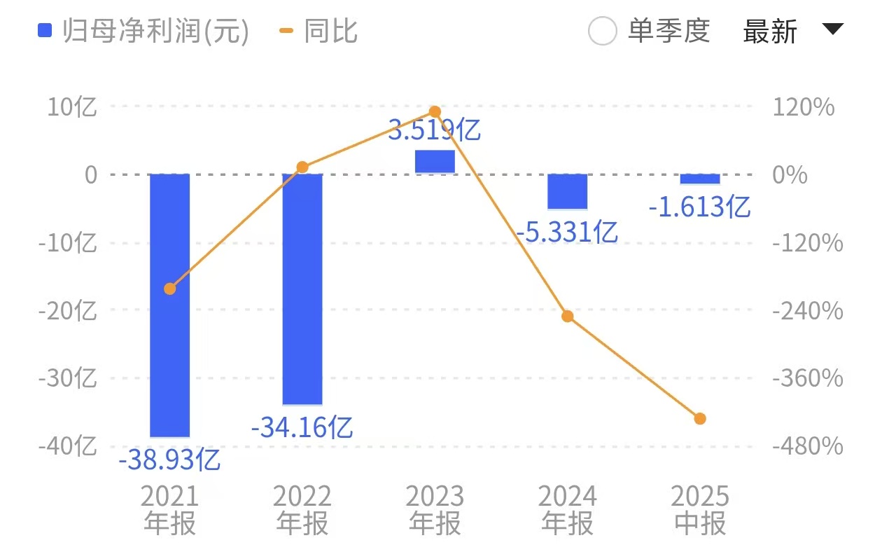 2025年中报显示,盈新发展上半年实现营收7.72亿元,归母净利润亏损1.61亿元,分别同比下滑50.97%、432.51%。在经历了2020年至2022年的业绩暴雷之后,盈新发展仅有2023年通过债务重整收益实现过短暂盈利。