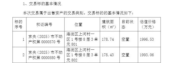 根据公司公告,此次航天软件拟出售的两处闲置房产地址位于北京市海淀区上河村一区1号楼3单元801/802,是公司于2002年11月28日签署商品房买卖合同并登记取得,付款方式为全款,共支付了275.02万元,当前房屋为空置状态。截至2025年7月31日,已计提折旧150.61万元,账面净值为124.41万元。