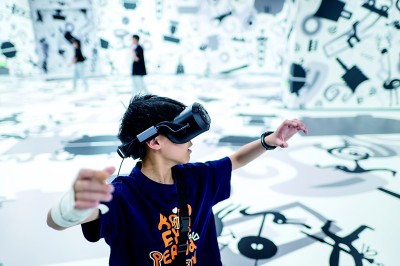 一名儿童使用VR设备,体验湖北省博物馆推出的电影级数字文物展《穿越青铜纪》。新华社发