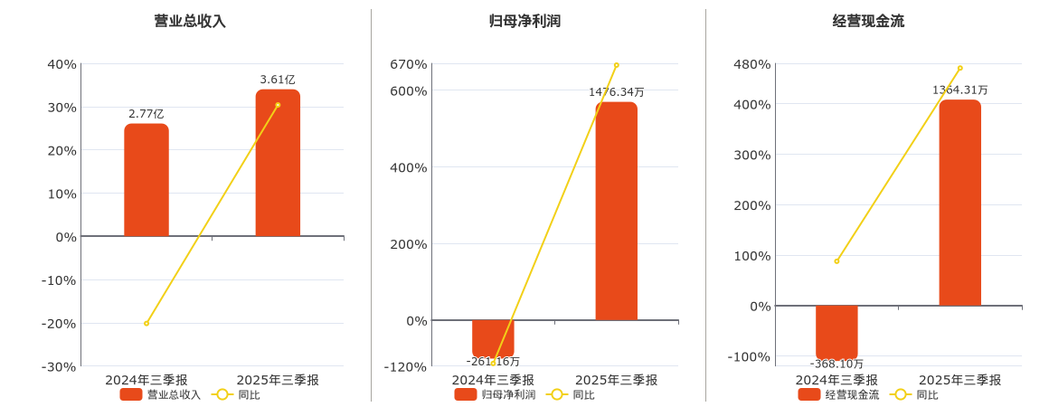 公司营业总收入为3.61亿元。归母净利润为1476.34万元。经营活动现金净流入为1364.31万元。